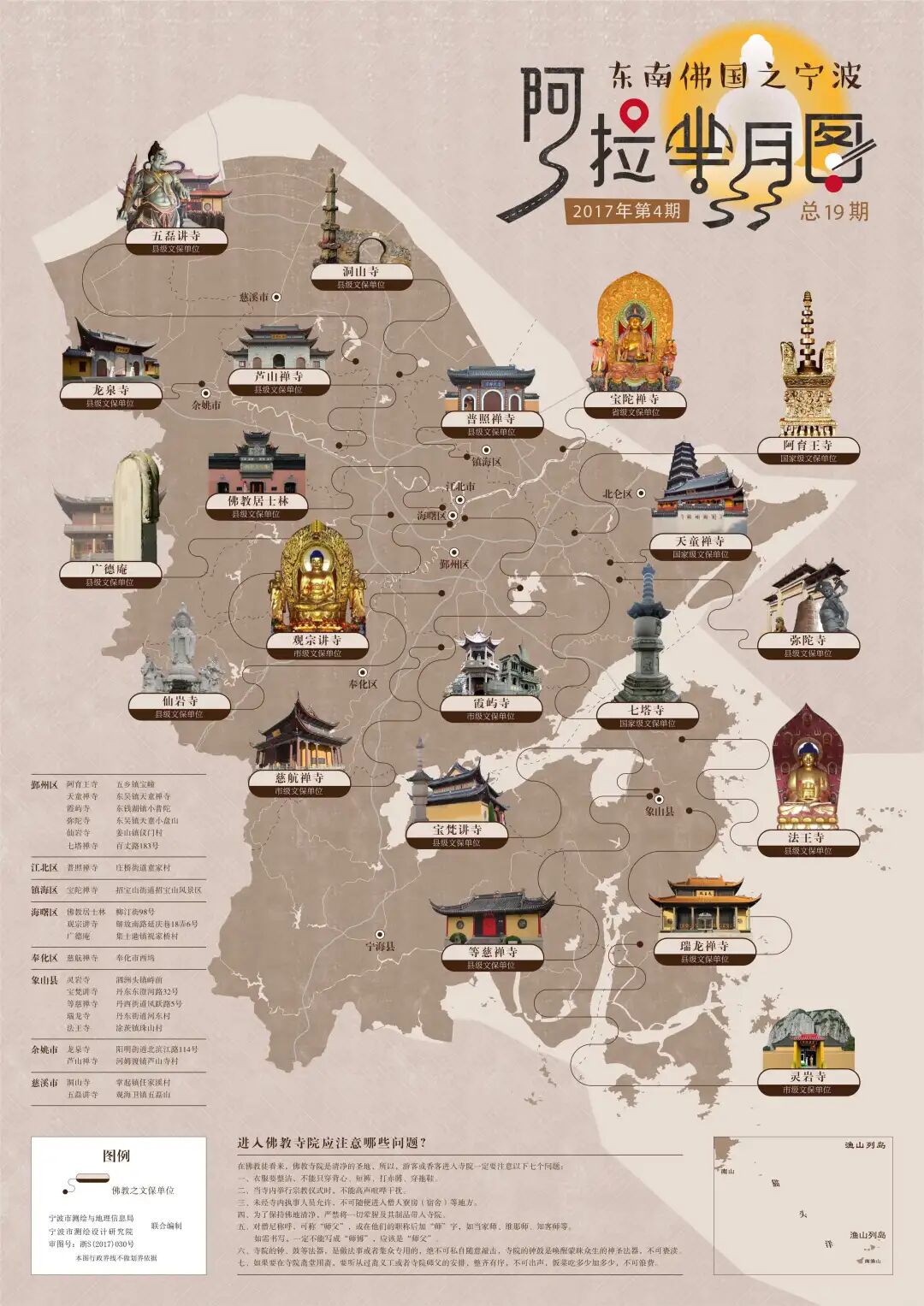 四、县级文保单位 1、洞山寺:洞山寺位于掌起镇任佳溪村,地处灵绪湖南缘的崇山峻岭间,寺院规模不大,但景色优美。据《镇海县志》记载,该寺始建于五代后梁开平初,北宋祥符中请额曰“幽栖洞山”,清乾隆八年僧觉性重修。 2、五磊讲寺:位于五磊山,风景秀丽独特,有浙东第一古寺之称。据记载,五磊寺创始于三国赤乌年间,后屡有兴废,至文革,几无遗迹。现建筑重建于1995年。 3、普照禅寺:普照禅寺,原名童家学堂,建于清道光二十六年,为童家私塾。2001年改为普照禅寺,现保存的建筑二进,院落二重,东南朝向呈四合院布局,占地面积为1540平方米。 4、佛教居士林:始建于元世祖忽必烈时期,几经沧桑,香火中断。现为远近闻名的宗教活动场所。 5、广德庵:始建于宋,现存建筑建于民国时期,局部为建国后重修。其宋徽宗御笔碑上刻着十道宋徽宗圣旨,极具历史价值,被称为刻在石头上的历史。